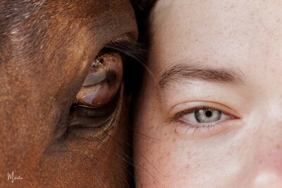 Een maand later kreeg ik van Kim de vraag: 'Jij doet ook black photography toch? Vind dat altijd zooo bizar mooi. Ook als je het oog van je paard en die van mezelf naast elkaar heb en dat de achtergrond dan zwart is.'